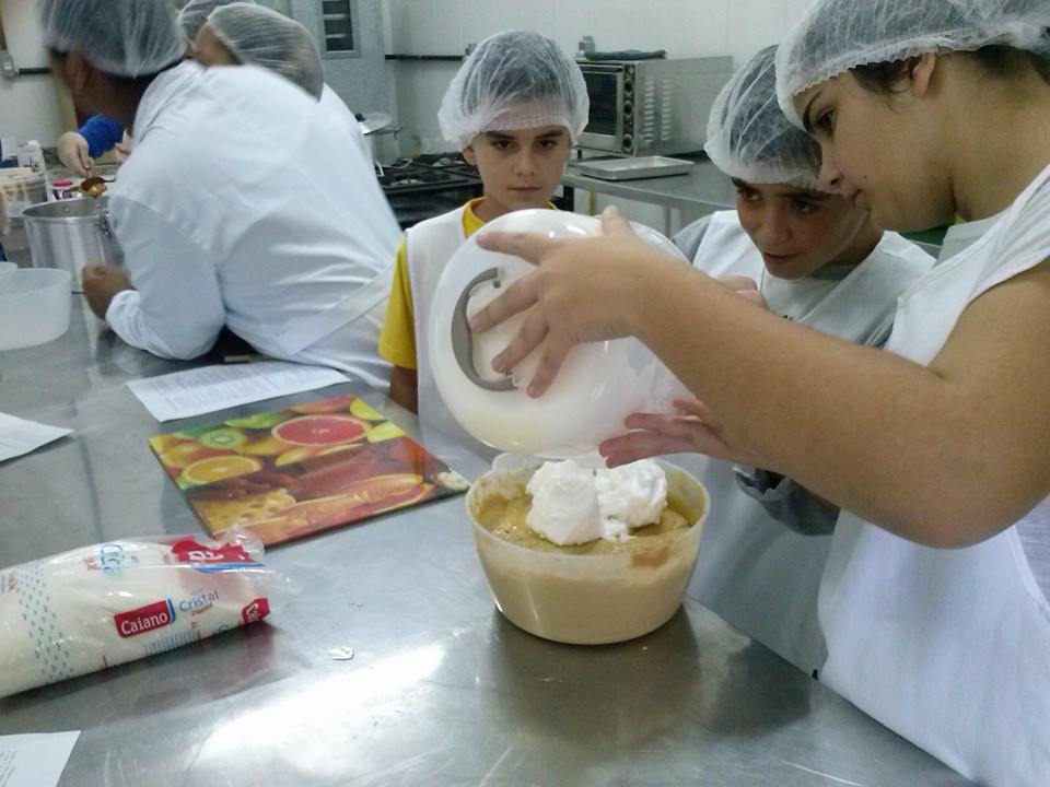 Alunos do turno da manhã que vieram na escola no turno da tarde para aprender a preparar alimentos com a professora Sofia Hoffmann.